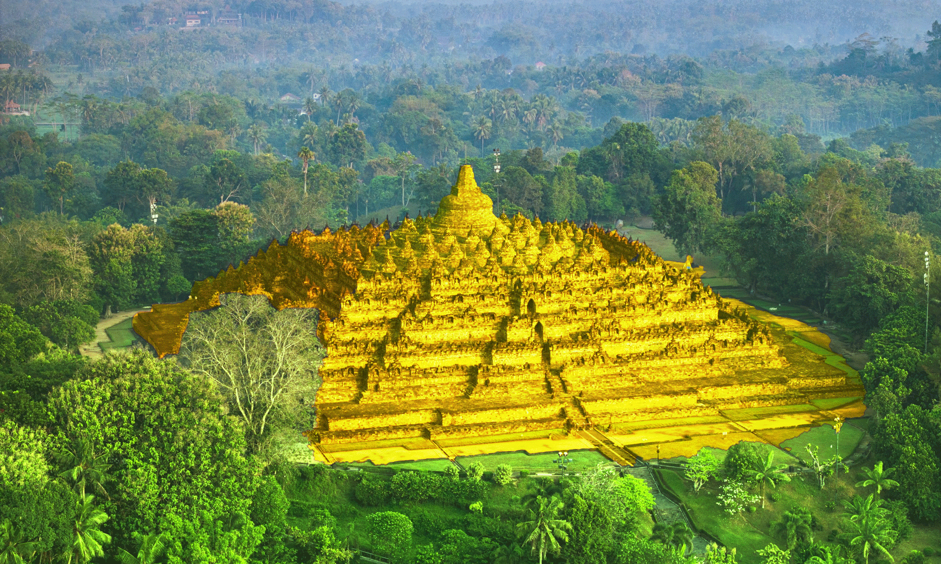 Situé dans le centre de Java, le site de Borobudur, construit aux alentours de l’an 800, semble avoir été abandonné vers l’an 1100. Le temple est à la fois un sanctuaire dédié au Bouddha, mais aussi un lieu de pèlerinage bouddhiste. C’est à la fois un stûpa et, vu du ciel, un mandala. Il forme un carré d’environ 113 mètres de côté avec, à chaque point cardinal, une partie en saillie accompagnée aux quatre angles par une partie en retrait. (source)