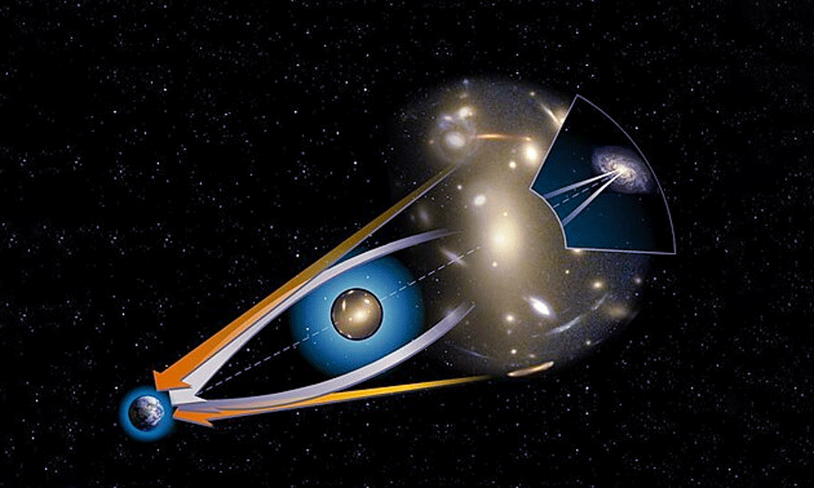 According to general relativity, a mass distribution diverts the light rays that pass nearby. In the case of a star, the effects remain limited because the mass involved is relatively small. But the effects can become significant and visible if the mass that disrupts the light is very large, for example in the case of a galaxy or a cluster of galaxies.
