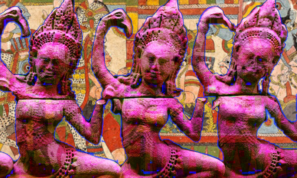 The goddesses dance in a row, raising their arms above them while forming with their hands a snake-bird’s head,