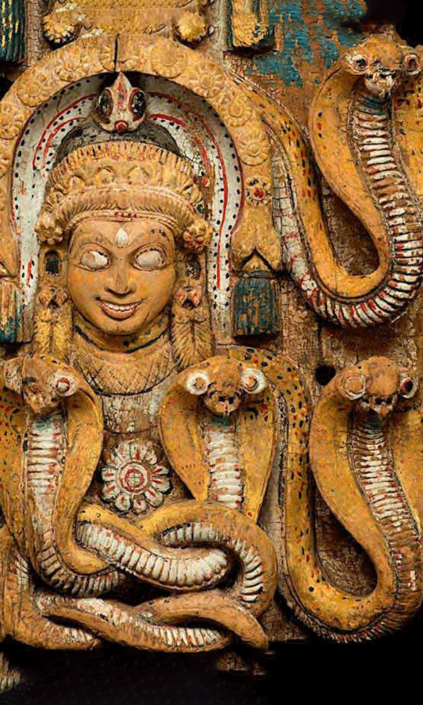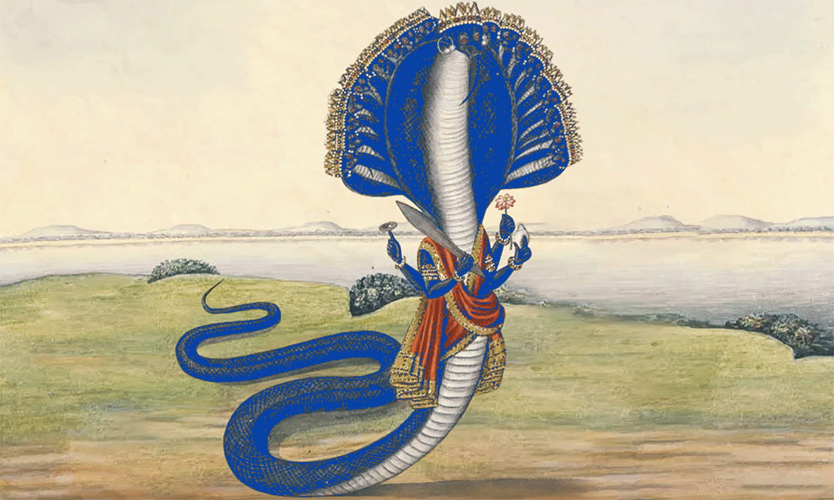 The most famous Nāga in the Hindu tradition is undoubtedly Shesha, the most recognizable with its one hundred heads. He is often depicted with Vishnu, who sometimes shelters under him, sometimes lies down on him. In any case, Shesha stubbornly persists in reproducing. Overlapped or riding, it constantly mates and gives abundant offspring.