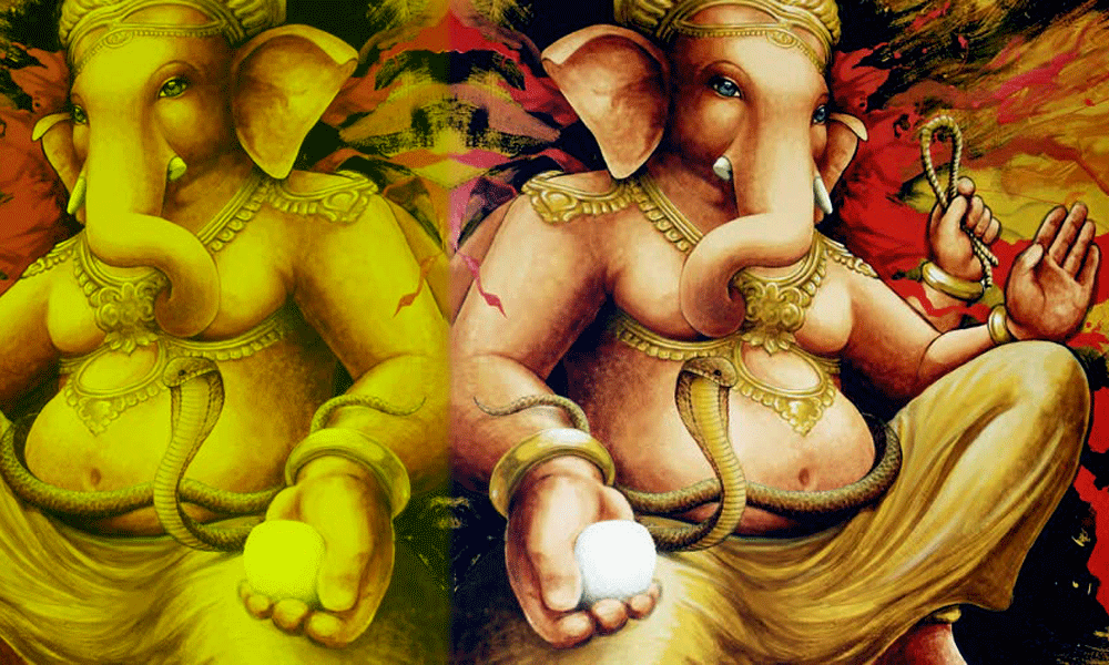 In the case of Ganesh, the snake is often draped around his neck or belly, or wrapped around his stomach like a belt, around a hand or ankles, or wrapped in the shape of a throne. For Shiva, the snake is most often in a garland around its neck. Shiva’s lingas often show him sheltered by many heads of nagas. (source)