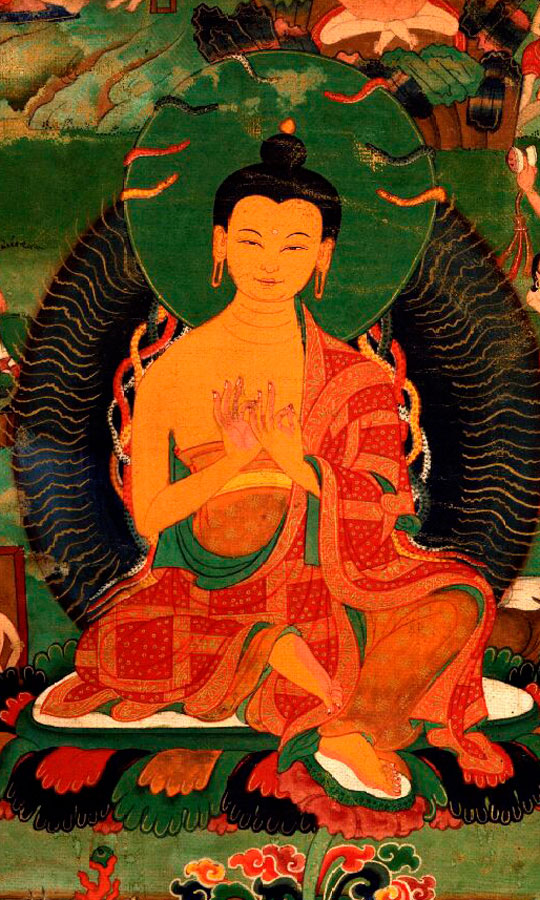 The Nāgas waited seven centuries for a great sage to be able to penetrate Buddha’s first secret. Nāgārjuna, Nāga Arjuna, the Prince of Serpents, was initiated by the Snake Kings in the certainty that everything is empty (śūnya). It is he who transmitted to humans the completed Buddhist teachings, those of the Mahāyāna. (source)