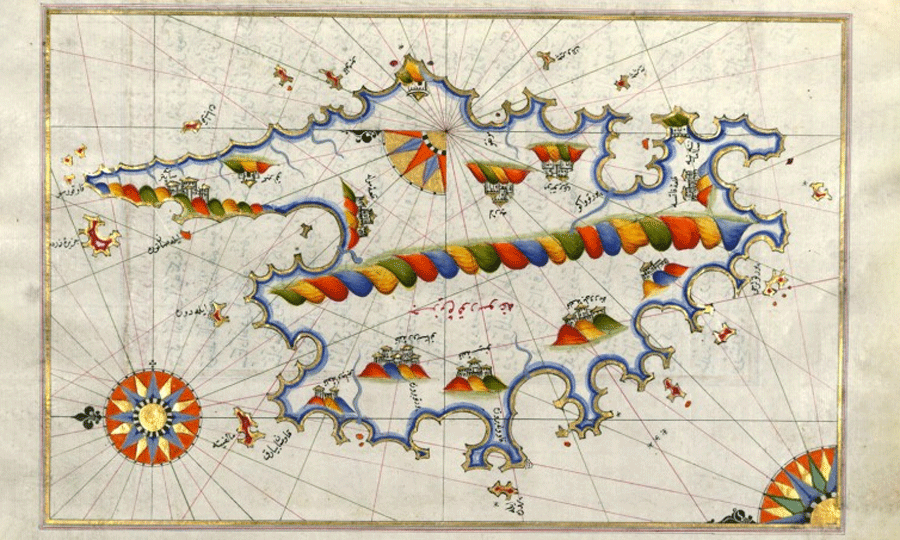 Piri Reis made many maps of the Mediterranean, mainly for his landmark work, the Kitab-ı Bahriye or Book of Navigation. We will see some of them later.