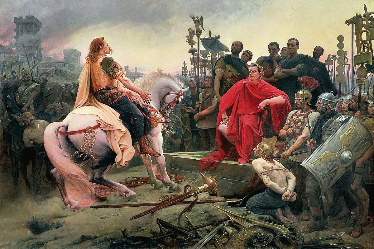 Showing Vercingetorix defeated, probably in chains, evokes not only the victory of Caesar, but also that of the entire Roman people against the Gallic enemy who inspired fear (Metus Gallicus) since the sack of Rome by Brennus in 390 EEC before the common era.