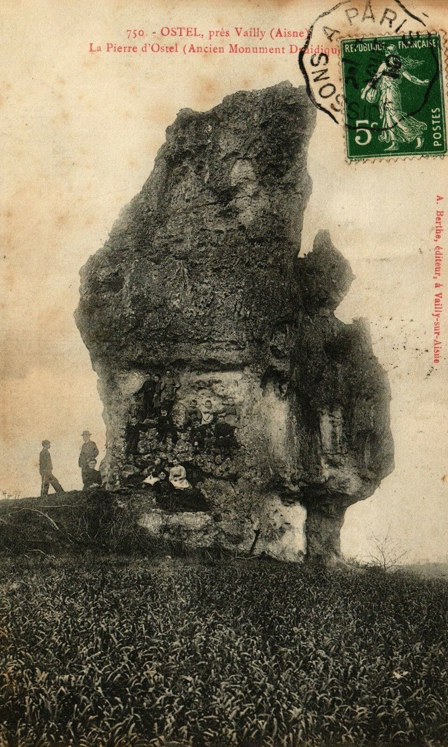 See opposite the Pierre d’Ostel, in Aisne (France). On the vintage postcard, one can read “ancient druidic monument“see below… It was then believed that these strange stones had once been used for rituals, which is very likely.
