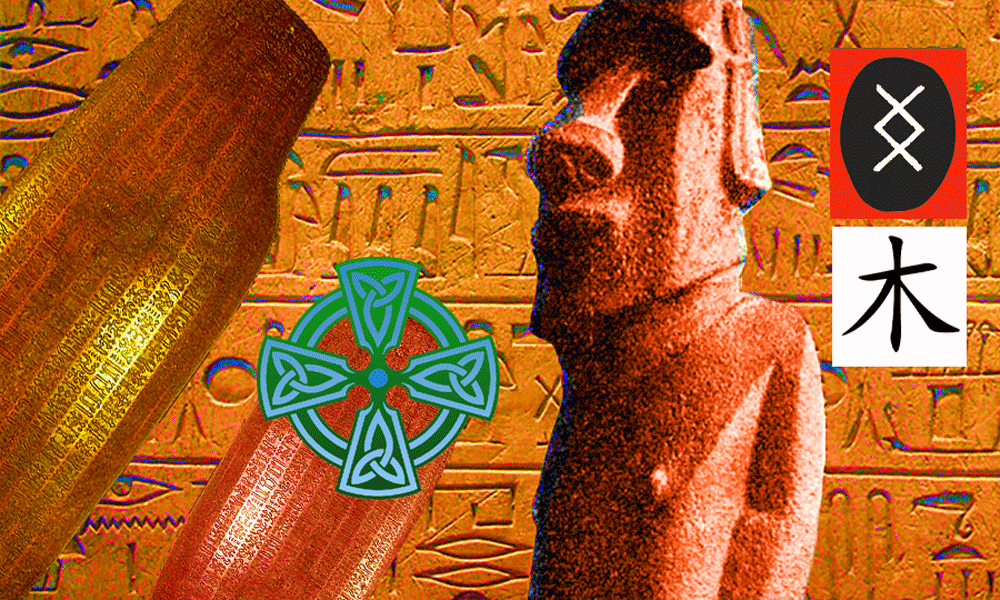 Sur fond de hiéroglyphes égyptiens, voici des rongorongo de l’île de Pâques, une croix celtique, un mohaï de l’île de Pâques également, une rune viking et un idéogramme chinois. Nous allons évoquer ces différentes représentations, car elles ne montrent pas des lettres au sens actuel du terme, mais plutôt des images de BD…