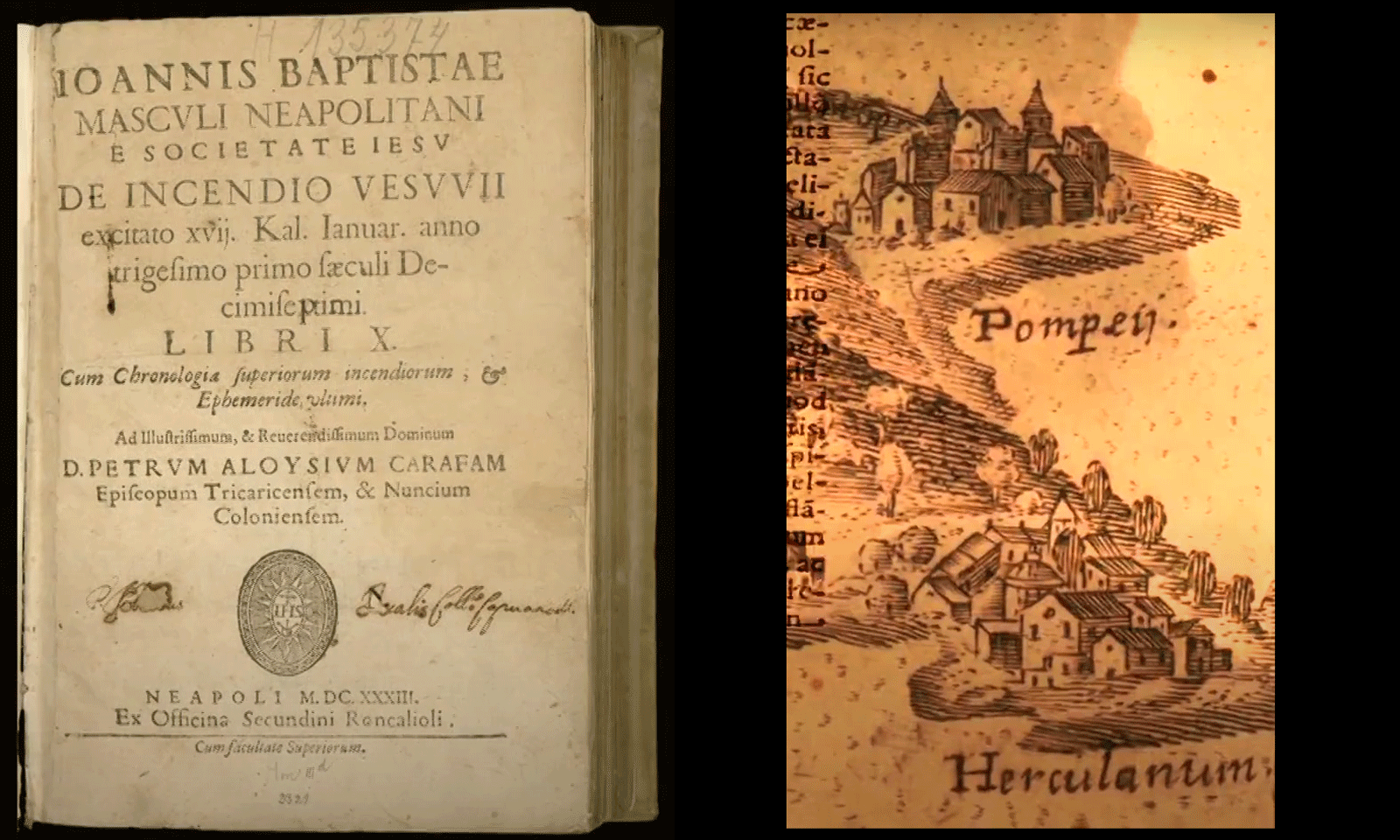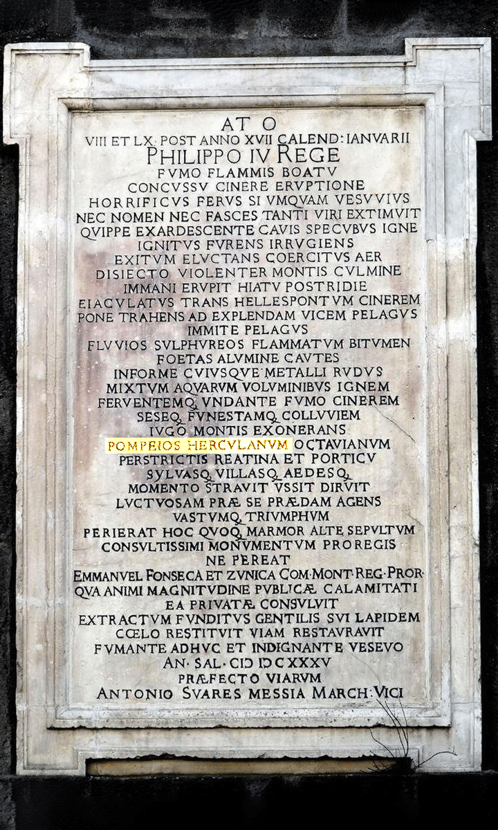 Daté de Naples 1633 — Y figure la narration de l’éruption et la mention de Pompéi et d’HerculanumVoir plus bas la stèle entière