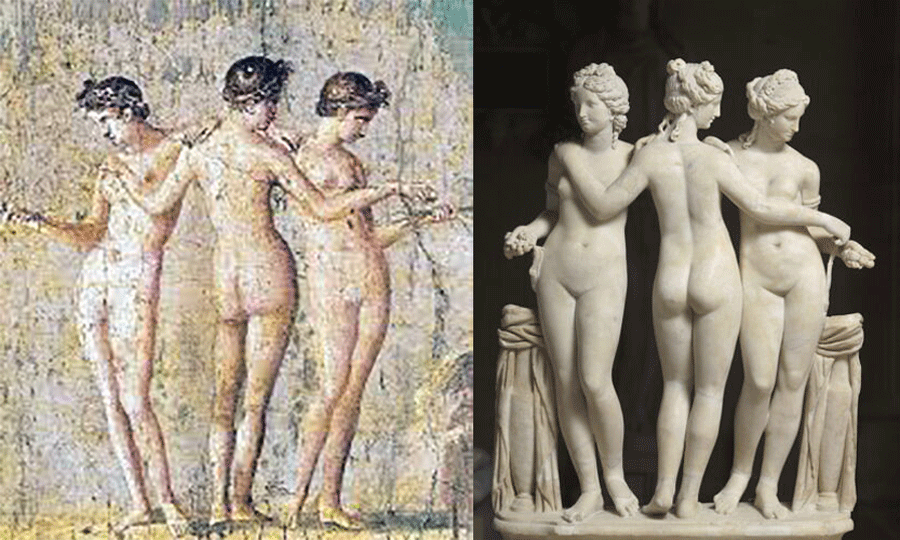 Les Trois Grâces : la fresque de Pompéi à gauche, une sculpture au musée du Louvre à droite. Existent aussi d’innombrables tableaux du Quattrocento italien.