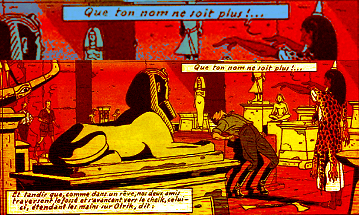 Le second mantra est prononcé par le cheikh quand il efface la mémoire du félon Olrik, prostré sur un sarcophage vide : « Que ton nom ne soit plus ! » lui assène le cheik. Celui-ci en perd tout souvenir de sa vie passée, et part en titubant à travers le grand Sahara. Il sera recueilli dans un autre album par le professeur Septimus qui en fera Guinea Pig, l’homme-robot de la Marque Jaune.