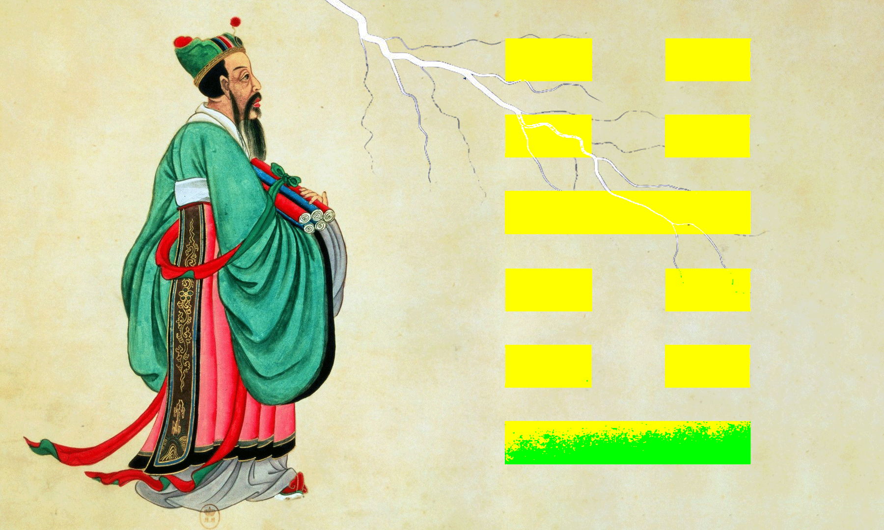 L’hexagramme Tchen est le fils aîné qui prend le commandement avec énergie et puissance. Un trait yang apparaît sous deux traits yin et exerce une puissante poussée vers le haut. Ce mouvement est si violent qu’il suscite l’effroi. Il a pour image le tonnerre qui jaillit de la terre et dont l’ébranlement provoque crainte et tremblement. (source)