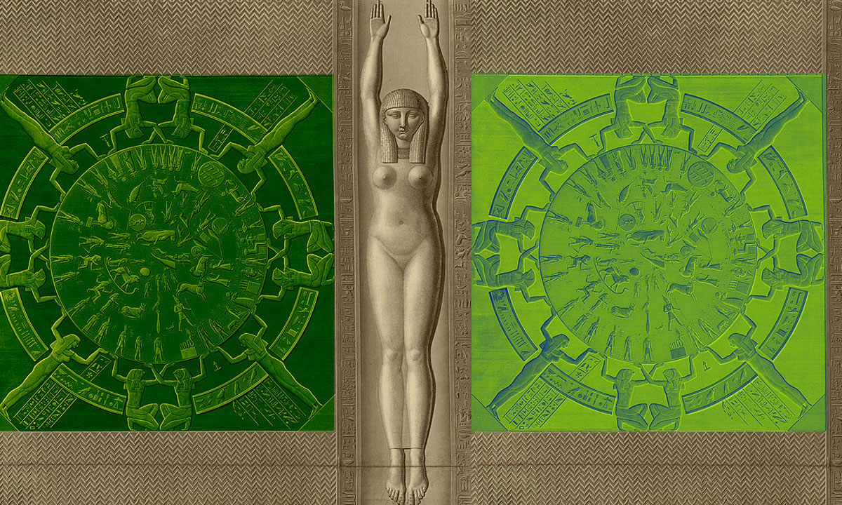 On comprend d’autant mieux l’émerveillement qu’a provoqué la découverte du zodiaque de Dendérah, pendant l’expédition d’Égypte. Voyez copie de la gravure qui figurait dans le compte-rendu de l’expédition. J’ai répété le sujet de chaque côté de la Déesse Nout, pour faire ressortir les détails par une mise en couleurs adaptée.