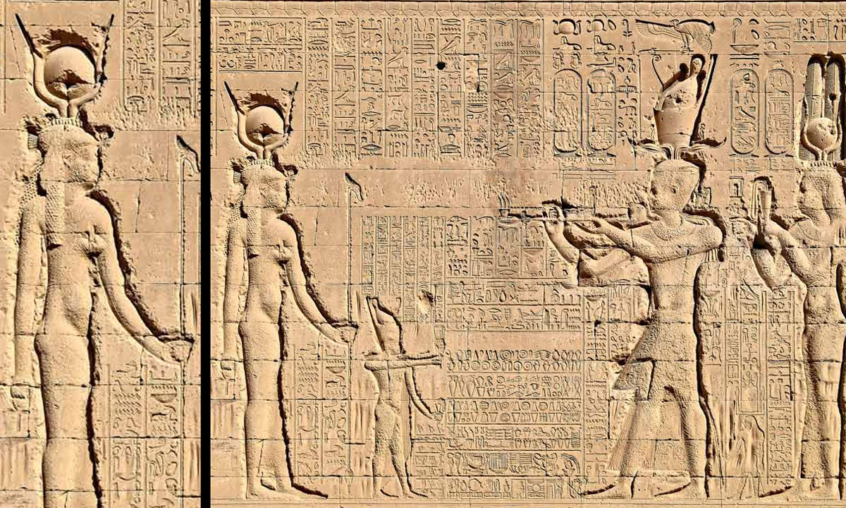 C’est donc sur ordre exprès que deux sculptureset même quatre : voir ci-dessous ont été ajoutées dans le bas-relief antique — non pas au plafond sur le zodiaque planisphère,  mais sur l’un des murs du temple. L’ajout est bien visible sur l’image qui suit.
